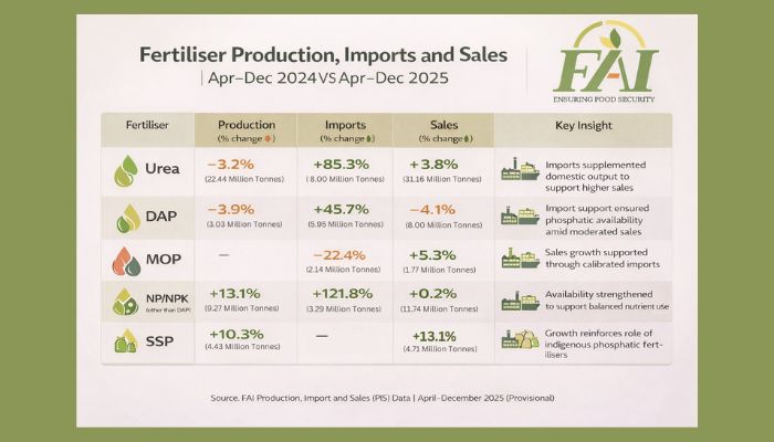 नई दिल्ली : देश के कृषि क्षेत्र के लिए एक राहत भरी खबर में, फर्टिलाइजर एसोसिएशन ऑफ इंडिया (FAI) ने चालू रबी सीजन के दौरान उर्वरकों की पर्याप्त उपलब्धता की पुष्टि की है। अप्रैल-दिसंबर 2025 की अवधि के आंकड़ों के अनुसार, सरकार और उद्योग जगत ने घरेलू उत्पादन और आयात के बीच एक सटीक संतुलन बनाकर आपूर्ति श्रृंखला को सुदृढ़ किया है। इस अवधि में यूरिया की बिक्री 3.8% बढ़कर 31.16 मिलियन टन तक पहुँच गई है। यूरिया की इस बढ़ती मांग को पूरा करने के लिए 22.44 मिलियन टन के घरेलू उत्पादन के साथ-साथ आयात में 85.3% की भारी वृद्धि की गई है, जिससे किसी भी तरह की किल्लत की आशंका को समाप्त कर दिया गया है।