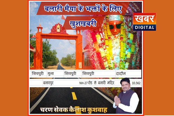 शिवपुरी/अनुज बालोठिया/खबर डिजिटल/ विधानसभा क्षेत्र में स्थित प्रसिद्ध बलारी माता मंदिर तक पहुंचने वाले मार्ग को आखिरकार प्रशासनिक स्वीकृति मिल गई है। दादौल से बलारपुर होते हुए एनएच-27 से बलारी माता मंदिर तक कुल 10.562 किलोमीटर लंबी सड़क के निर्माण का रास्ता साफ हो गया है। पिछले कई वर्षों से यह मार्ग अत्यंत जर्जर अवस्था में था, जिसके कारण श्रद्धालुओं को भारी कठिनाइयों का सामना करना पड़ता था। विशेषकर नवरात्र, मेलों और अन्य धार्मिक अवसरों पर माता के भक्तों को मंदिर तक पहुंचने में काफी दिक्कतें झेलनी पड़ती थीं। इस समस्या को लेकर लगातार जनप्रतिनिधियों और प्रशासन के समक्ष मांग उठाई जा रही थी।