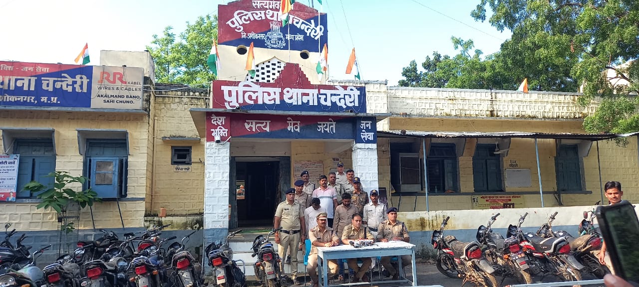 चंदेरी क्षेत्र में बढ़ रही लगातार मोटरसाइकिल चोरी की वारदातों पर आखिरकार चंदेरी पुलिस को बड़ी सफलता हाथ लगी है जिससे साइबर सेल,सीसीटीवी फुटेज के आधार पर चोरी के महत्वपूर्ण सुराग हाथ लगे जिससे आरोपी गणों तक पहुंचने में मदद मिल सकी। चंदेरी पुलिस ने दो शातिर चोरो को गिरफ्तार किया है जिनसे 15 मोटरसाइकिल भी बरामद की हैं जिनकी कीमत लगभग 10 लाख रुपए आंकी गई है जिन्हें चोरों ने अशोकनगर जिले के अन्य हिस्सों एवं दूसरे जिलों से चुराई गई होना बताया है।