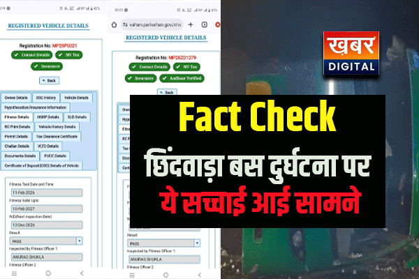 भोपाल/ खबर डिजिटल/ chhindwara bus accident Fact check: छिंदवाड़ा में हुई हृदयविदारक बस दुर्घटना के उपरांत वाहनों के दस्तावेजों को लेकर प्रसारित की जा रही प्रारंभिक जानकारियां जांच में गलत पाई गई हैं। आधिकारिक जांच और ‘mariavahan app’ से प्राप्त आंकड़ों के अनुसार, दुर्घटनाग्रस्त बस और पिकअप वाहन, दोनों की फिटनेस और बीमा संबंधी दस्तावेज पूरी तरह अपडेट और वैध हैं।