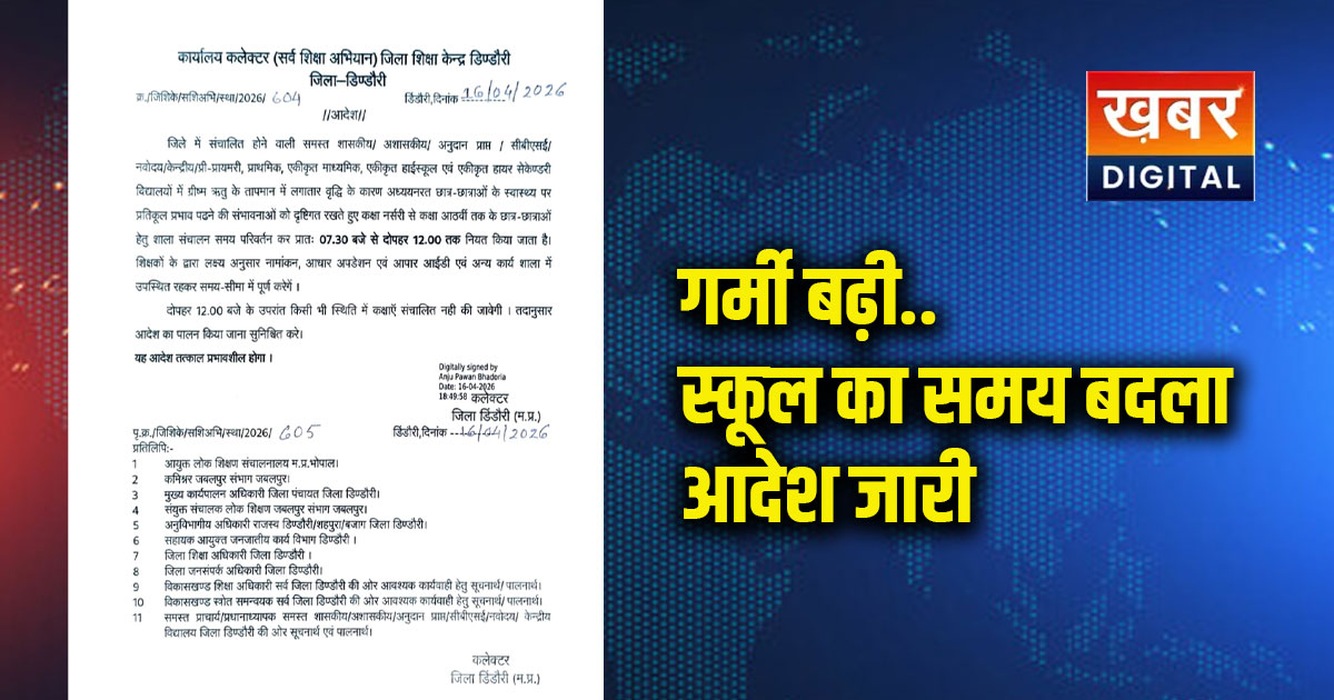 डिंडोरी, Dindori Heat Alert: स्कूल समय में परिवर्तन, सुबह 7:30 से दोपहर 12 बजे तक संचालित होंगी कक्षाएं जिले में बढ़ते तापमान को देखते हुए छात्र-छात्राओं के स्वास्थ्य की सुरक्षा हेतु जिला प्रशासन द्वारा महत्वपूर्ण निर्णय लिया गया है। कलेक्टर अंजू पवन भदौरिया के निर्देशानुसार कक्षा नर्सरी से कक्षा आठवीं तक के विद्यार्थियों के लिए शाला संचालन समय में परिवर्तन किया गया है।