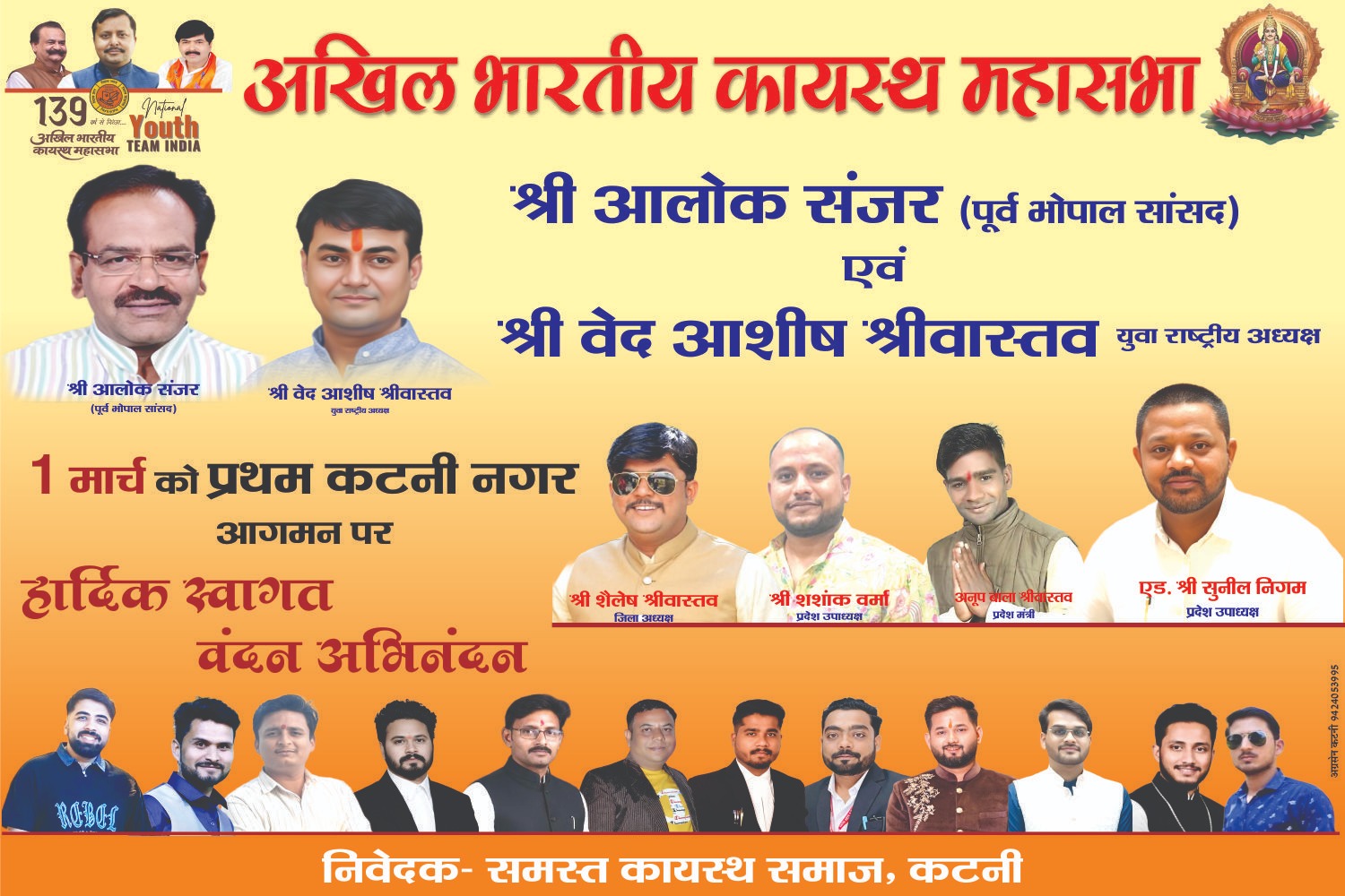 सौरभ श्रीवास्तव संवाददाता कटनी 1 मार्च (रविवार)। कटनी जिले में अखिल भारतीय कायस्थ महासभा के राष्ट्रीय अध्यक्ष श्री वेद आशीष जी एवं लोकसभा के पूर्व सांसद श्री आलोक संजर जी के प्रथम नगर आगमन को लेकर कायस्थ समाज में हर्ष का वातावरण है। उनके स्वागत की व्यापक तैयारियां की गई हैं।प्राप्त जानकारी के अनुसार, राष्ट्रीय अध्यक्ष एवं पूर्व सांसद के आगमन पर शहर में जगह-जगह पुष्पहार एवं अभिनंदन कार्यक्रम आयोजित किए जाएंगे।