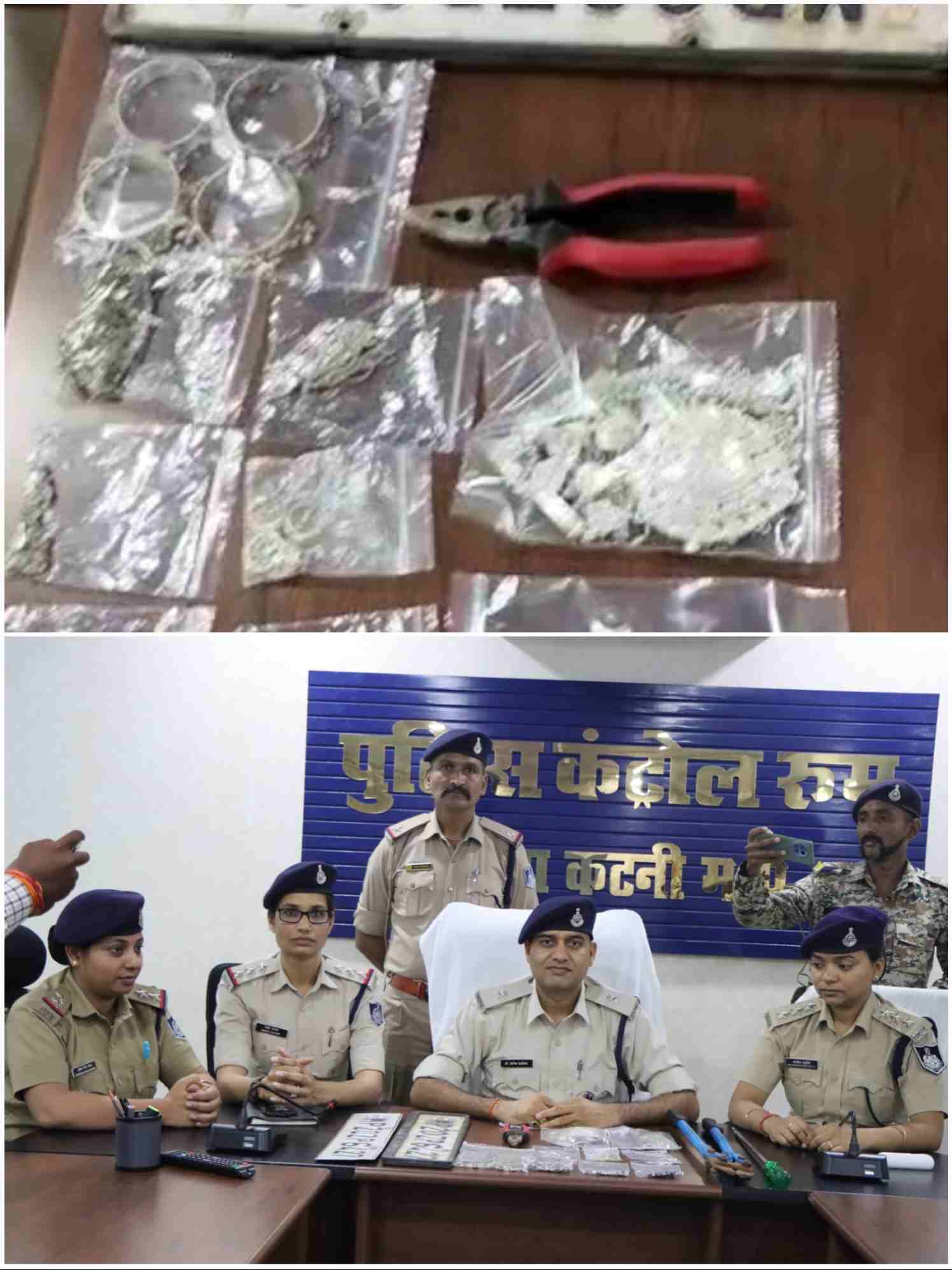 कटनी/ सौरभ श्रीवास्तव /पुलिस अधीक्षक अभिनय विश्वकर्मा (भा.पु.से.) के आदेशानुसार एवं अतिरिक्ता पुलिस अधीक्षक संतोष डेहरिया के मार्गदर्शन तथा अनुविभागीय अधिकारी पुलिस स्लीमनाबाद आंकाक्षा चतुर्वेदी के दिशा निर्देशन में दिनांक 01.08.2025 के समया रात्रि 12.30 बजे गश्त में मुस्तैदी से चैंकिग करते हुए थाना प्रभारी उप. निरी. प्रतीक्षा सिंह चंदेल, सउनि बीएम चौधरी, प्रआर 497 अवधेश मिश्रा, प्रआर 167 शिवसिंह, आर. 279 राजभान पटेल ने एक चौकी सलैया तरफ से आती हुई संदिग्ध कार (बिना नंबर प्लेट) को रोककर कार को चैक किया जिसमें कार की पीछे की सीट पर कटर, पेशकस, प्लास मिलने पर संदेही 01. अजय यादव पिता राजाराम यादव उम्र 36 साल 02. रिंकु यादव पित राजकुमार यादव उम्र 18 साल दोनो निवासी ग्राम खिरहनी थाना स्लीमनाबाद जिला कटर्न (म.प्र) से हिकमत अमली से पूछताछ पर बताये कि अपने साथी सौरभ वैष्णव (बैरागी) गुलशन वैष्णव (बैरागी) नि. घाट सिमरिया सिहोरा को साथ लेकर बिलहरी-तिलगवां के रास्त से देवगांव होकर रीठी-मोहास के आगे के ग्राम बड़गांव थाना रीठी एसबीआई बड़गांव के सामने सूने पड़े मकान के ताला की कुंडी को तोड़कर अपने साथी सौरभ वैष्णव (बैरागी) गुलशन वैष्णव (बैरागी) के साथ रात्रि में घर के अन्दर घुसकर रखी आलमारी से चांदी के जेवरात चोरी कर ले आये थे। जो आरोपी बाकल के रास्ते से अपने घर जा रहे थे। बाकत पुलिस को रोड़ मे खड़ा देखकर अन्य आरोपी सौरभ वैष्णव (बैरागी), गुलशन वैष्णव (बैरागी कुछ दूर पहले कार रुकवाकर पेशाब करने के बहाने उतर कर खेतो के रास्ते भाग गये थे चोरी किया हुआ चांदी का जेवरात एवं कटर वगैरह कार की पीछे की सीट में नीचे छुपाक रखे थे। पूछताछ के दौरान आरोपी अजय यादव व्दारा थाना बाकल क्षेत्र में दिनांक 19.03.25 को दिन में ताला तोडकर चोरी करना स्वीकार किये है। जो आरोपी अजय याद के हिस्से में आये चांदी के जेवर को थाना बाकल पुलिस द्वारा जप्त कर आरोपी को गिरफ्तार किया गया है। थाना रीठी में अपराध क्र. 300/25 धारा 331(4), 305ए बीएनएस पंजीबध्द कर दूसरे आरोपी रिंकू यादव को थाना रीठी को माल-मशरूका और औजार सहित सौप दिया गया हैं। मामले में अन्य आरोपी सौरभ वैष्षण, गुलशन वैष्णव, व मोहित गाँड की तलाश पता साजी की जा रही हैं। का कायम कर, विवेचना में लिया गया *जप्तशुदा मशरूका* 01. एक चांदी का बड़ा हाफ करधन 02. एक चांदी का छोटा हाफकरधन 03. एक जोड़ी चांदी की पुरानी पायल 04. दो जोड़ी चांदी की छैल चूड़ी 05. दो जोड़ी चांदी की पुरानी अंगुठी 06. दो चांदी के बच्चो वाले चूड़ा 07. एक जोड़ी चांदी बच्चो की पायल 08. एक बच्चो का करधन 09. एक हाय चंद्रमा तीन लॉकेट वाला 10. एक लोहे का बड़ा कटर 11. दो नंबर प्लेट mp 20 zp 6427 लिखा हुआ 12. एक प्लास लाल रंग का कवर वाला 13. एक बड़ा पेचकश हरे मूठ का एवं एक बिना नंबर की स्वीफ्ट कार सफेद र