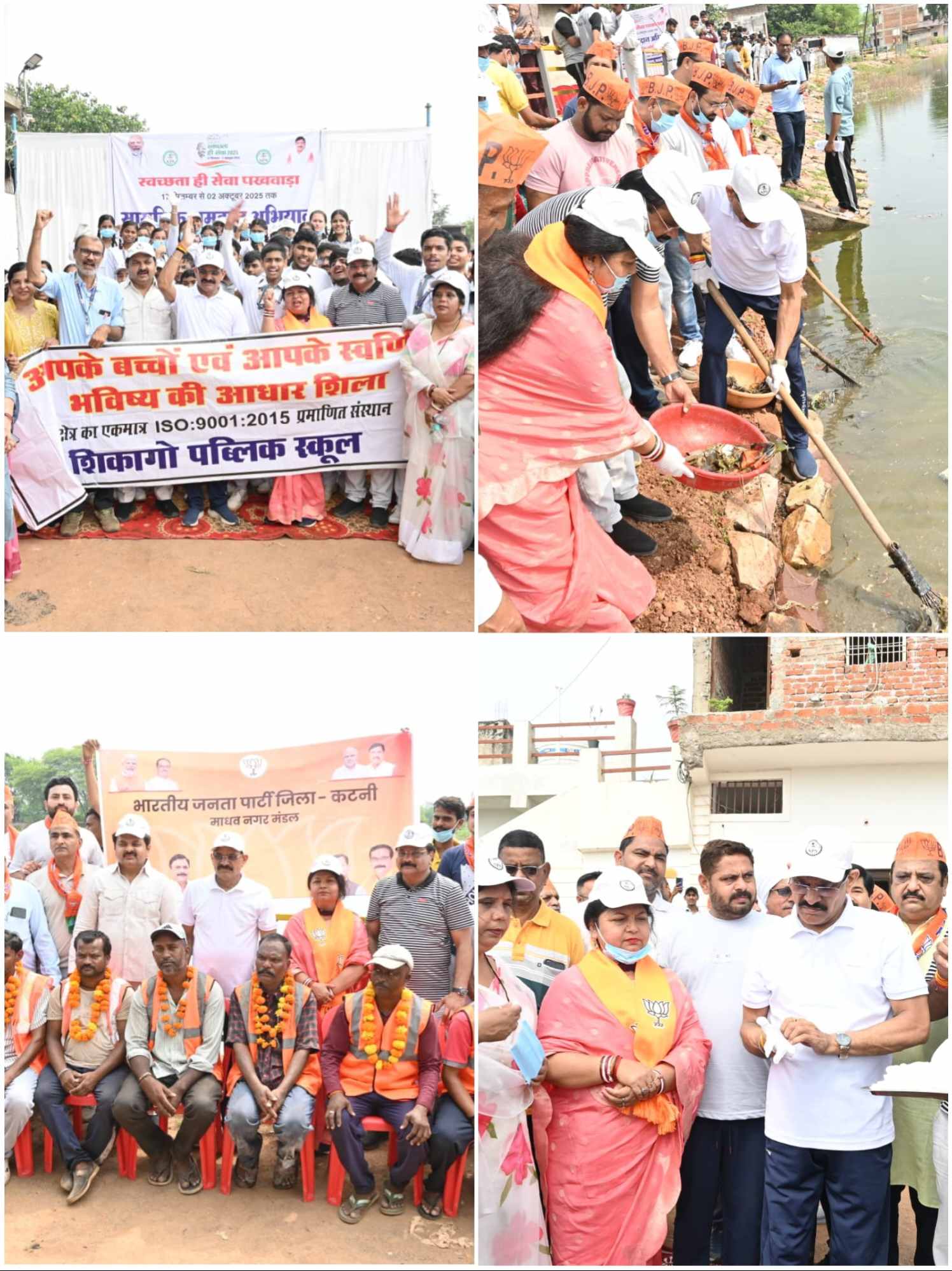 कटनी (✍️सौरभ श्रीवास्तव ) – शासन निर्देशानुसार नगर निगम द्वारा 17 सितंबर से 2 अक्टूबर 2025 तक आयोजित होने वाले स्वच्छता ही सेवा अभियान का शुभारंभ बुधवार प्रातः खजुराहो सांसद श्री विष्णु दत्त शर्मा, महापौर श्रीमती प्रीति संजीव सूरी, निगमाध्यक्ष श्री मनीष पाठक, पार्षदगण सहित अधिकारियों, समाजसेवी संस्थाओं, स्कूली छात्रों एवं गणमान्य नागरिकों की मौजूदगी में माधवनगर स्थित अमीरगंज तालाब में सामूहिक श्रमदान के साथ हुआ। स्वच्छता ही सेवा अभियान के शुभारंभ के अवसर पर लोकसभा खजुराहो सांसद भाजपा जिलाध्यक्ष दीपक टंडन सोनी, पूर्व महापौर शशांक श्रीवास्तव, पूर्व जिलाध्यक्ष पीताम्बर टोपनानी, मेयर इन काउंसिल सदस्य सुभाष शिब्बू साहू, गोविंद चावला, सुमन राजू माखीजा, डॉ रमेश सोनी, पार्षद सीमा श्रीवास्तव, शकुंतला सोनी, विनोद लाला यादव, निगमायुक्त नीलेश दुबे, एस.डी.एम प्रमोद चतुर्वेदी ,उपायुक्त श्री शैलेश गुप्ता, पूर्व पार्षद राजू माखीजा, राजकिशोर यादव, विजय डब्बू रजक, रजनी विष्णु केवट, सौरभ अग्रवाल, सुनील उपाध्याय, आशीष गुप्ता, देवानंद आसरानी, मृदुल द्विवेदी, ब्रांड एंबेसडर नीलम जगवानी, निशा तिवारी, आशुतोष मानके एवं उनकी टीम शिकागो पब्लिक स्कूल के छात्र एवं शिक्षक- शिक्षिका सहित अन्य जनों की मौजूदगी रही। विशाल जनसमूह की मौजूदगी में स्वच्छता जागरूकता के नारों के साथ सामूहिक श्रमदान कर तालाब के किनारे फैले विभिन्न अपशिष्ट, पन्नियां, पूजन सामग्री, कपड़े, मूर्ति आदि की सफाई की जाकर कैरीबैग में एकत्रित किया गया। सामूहिक श्रमदान के दौरान फावड़े व पंजे के माध्यम से तालाब के किनारे की चोई, गीला कचरा, अपशिष्ट को निकाला गया और कतार बनकर तसले के माध्यम से अपशिष्ट को निगम वाहन में एकत्रित किया गया जाकर स्वच्छता का संदेश प्रसारित किया गया। स्वच्छता पखवाड़ा को संबोधित करते हुए सांसद श्री विष्णुदत्त शर्मा ने कहा कि प्रधानमंत्री जी का स्वच्छ भारत मिशन और स्वच्छता अभियान देश के विश्व गुरू बनाने की ओर अग्रसर कर रहा है। स्वच्छता को अपनाने से हम स्वच्छ रहेंगे तथा देश को विकसित राष्ट्र बनाने में अपना महत्वपूर्ण योगदान कर पाएंगे। स्वच्छता को स्वभाव में अपनाने पर हमारे शरीर के साथ-साथ हमारा मन भी निर्मल होगा। हमारे मन में लोगों के प्रति सद्भाव होगा जिससे हम एक सकारात्मक दृष्टिकोण के साथ आगे बढ़ेगे। इस दौरान उन्होंने इंदौर शहर की स्वच्छता हेतु नागरिकों द्वारा प्रदान किये जाने वाले सहयोग की जानकारी से अवगत कराते हुए शहर की सफाई व्यवस्था में सहयोग प्रदान करने की बात कही। कार्यक्रम के दौरान नगर को साफ एवं स्वच्छ रखने में उत्कृष्ट सहयोग प्रदान करने वाले स्वच्छता दूतों को पुष्पहार से सम्मानित किया जा