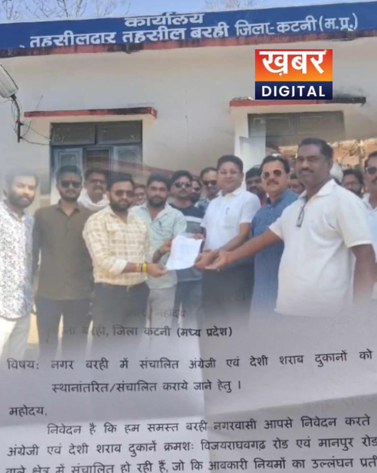 कटनी– जिले के बरही नगर में आबादी क्षेत्र के बीच संचालित शराब दुकानों को हटाने की मांग को लेकर स्थानीय लोगों का विरोध तेज होता जा रहा है। गुरुवार को व्यापारी, जनप्रतिनिधि और समाजसेवियों सहित बड़ी संख्या में नगरवासी तहसील कार्यालय पहुंचे और प्रशासन के नाम तहसीलदार को ज्ञापन सौंपा।नगरवासियों का कहना है कि विजयराघवगढ़ और अमरपुर मार्ग पर स्थित शराब दुकानें रिहायशी इलाके के बीच संचालित हो रही हैं, जिससे क्षेत्र का सामाजिक माहौल लगातार खराब हो रहा है। दुकानों के आसपास शराबियों का जमावड़ा लगा रहता है, जिससे महिलाओं और युवतियों को असुरक्षा का सामना करना पड़ रहा है।स्थानीय लोगों ने हाल ही में हुई एक मारपीट की घटना का भी हवाला देते हुए कानून-व्यवस्था पर सवाल खड़े किए हैं। उनका कहना है कि यदि जल्द ही इन दुकानों को हटाया नहीं गया, तो स्थिति और बिगड़ सकती है।ज्ञापन के माध्यम से नगरवासियों ने मांग की है कि शराब दुकानों को आबादी क्षेत्र से कम से कम एक किलोमीटर दूर स्थानांतरित किया जाए। साथ ही चेतावनी दी गई है कि यदि प्रशासन द्वारा उचित कार्रवाई नहीं की गई, तो वे उग्र आंदोलन करने के लिए बाध्य होंगे।प्रशासन की ओर से मामले को गंभीरता से लेते हुए जांच और उचित कार्रवाई का आश्वासन दिया गया है।