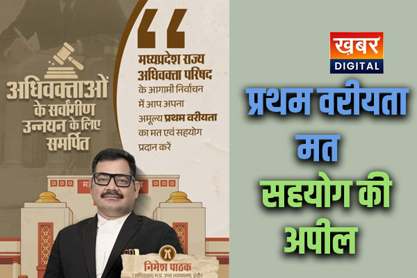 इंदौर/नरेंद्र महावर/खबर डिजिटल/ मध्यप्रदेश राज्य अधिवक्ता परिषद के आगामी निर्वाचन को लेकर सरगर्मियां तेज हो गई हैं। म.प्र. उच्च न्यायालय, इंदौर के अधिवक्ता निमेश पाठक ने अधिवक्ताओं के सर्वांगीण उन्नयन को अपना लक्ष्य बताते हुए साथियों से प्रथम वरीयता का मत एवं सहयोग प्रदान करने की अपील की है।