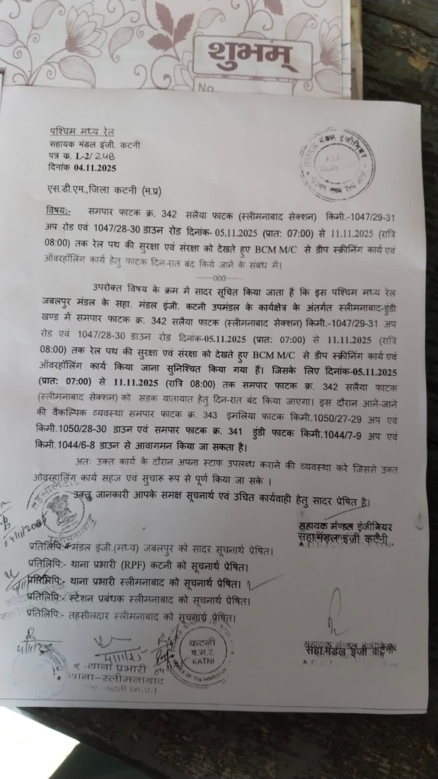 कटनी – पश्चिम मध्य रेलवे, जबलपुर मंडल के कटनी उपमंडल अंतर्गत आने वाले स्लीमनाबाद–डुंडी रेल खंड पर स्थित समपार फाटक क्रमांक 342 (सलैया फाटक) आगामी 05 नवम्बर से 11 नवम्बर 2025 तक बंद रहेगा। इस अवधि में सुबह 07:00 बजे से लेकर रात 08:00 बजे तक फाटक पर सभी प्रकार के यातायात को प्रतिबंधित किया जाएगा।