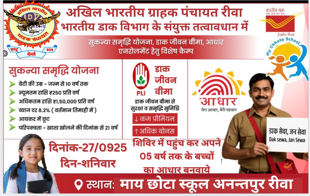 रीवा में डाक विभाग और ग्राहक पंचायत का जागरूकता शिविर: बच्चों का आधार पंजीकरण और सुकन्या योजना पर रहेगा फोकस