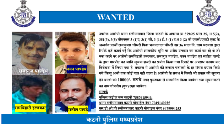 सौरभ श्रीवास्तव/खबर डिजिटल/कटनी– थाना स्लीमनाबाद में दर्ज अपराध क्रमांक 579/25 धारा 25, 115(2), 351(3), 3(5) बीएनएस व एससी/एसटी एक्ट की विभिन्न धाराओं में नामजद चार आरोपी — राम बिहारी हल्दकार पिता कठोरी लाल हल्दकार (45 वर्ष), रामानुज पाण्डेय पिता स्व. रामकिशोर पाण्डेय (60 वर्ष 4 माह), सतीष पाण्डेय पिता नारायण पाण्डेय (34 वर्ष 3 माह), पवन पाण्डेय पिता शंभुज पाण्डेय (31 वर्ष),सभी निवासी मटवारा, थाना स्लीमनाबाद जिला कटनी — घटना के बाद से फरार हैं।पुलिस द्वारा लगातार पतासाजी के बावजूद आरोपियों का कोई सुराग नहीं लग सका। मामले की गंभीरता को देखते हुए पुलिस अधीक्षक कटनी अभिनय विश्वकर्मा ने पुलिस रेगुलेशन के पैरा क्रमांक 80-ए के तहत प्रत्येक आरोपी की गिरफ्तारी पर 10,000 रुपये का नगद इनाम घोषित किया है।इनाम की घोषणा के साथ पुलिस ने यह भी स्पष्ट किया है कि सूचना देने वाले का नाम गोपनीय रखा जाएगा, और पुरस्कार वितरण का अंतिम निर्णय पुलिस अधीक्षक कटनी द्वारा ही किया जाएगा।फरार आरोपियों की शीघ्र गिरफ्तारी एवं भविष्य में अपराध की पुनरावृत्ति रोकने के उद्देश्य से इनाम राशि बढ़ाये जाने का प्रतिवेदन उप पुलिस महानिरीक्षक जबलपुर रेंज को भेजा गया है।संपर्क सूत्र:📞 पुलिस नियंत्रण कक्ष कटनी – 7587615946, 07622-220412📞 थाना प्रभारी स्लीमनाबाद – 9691919706