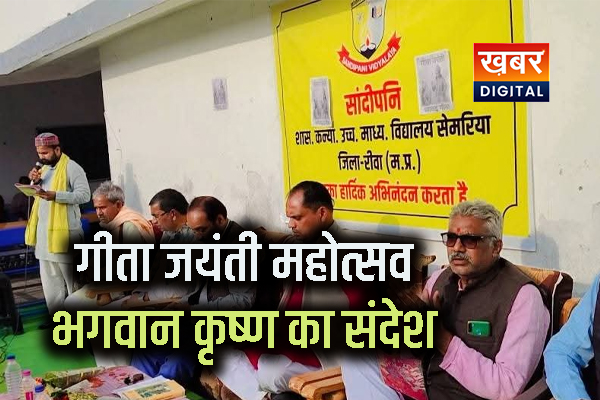 रीवा/अरविन्द तिवारी/खबर डिजिटल/ मध्य प्रदेश शासन के निर्देशानुसार सांदीपनि विद्यालय सेमरिया में गीता महोत्सव के उपलक्ष्य में गीता पर प्रवचन का आयोजन किया गया, जिसमें मुख्य वक्ता के रूप में गीतागीत पुस्तक के रचनाकार एवं कथा वक्ता पंडित अमित अभय रामदास रहे। कार्यक्रम की अध्यक्षता नगर परिषद सेमरिया के अध्यक्ष प्रतिनिधि एवं जाने माने व्यवसायी व सामाजिक कार्यकर्ता अविनाश सोनी ने की, वहीं मुख्य अतिथि के रूप में पूर्व प्राचार्य सुरेन्द्र मिश्रा रहे, जबकि विशिष्ट अतिथि के रूप में भाजपा नेता नन्द कुमार अग्निहोत्री रहे। अन्य अतिथियों में देवेंद्र त्रिपाठी,विवेक गौतम रहे । कार्यक्रम का संचालन विद्यालय की शिक्षिका अनिता तिवारी ने किया और आभार प्रदर्शन विद्यालय के प्राचार्य शंकर दयाल दीक्षित ने किया । अतिथियों का स्वागत धीरेन्द्र कुमार कुशवाहा ने किया जबकि स्वयं प्रेरणा गायन विद्यालय की बच्चियों ने किया ।
