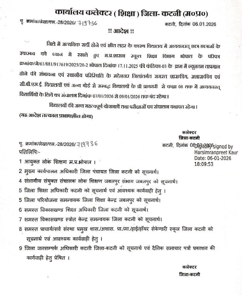 कटनी – उत्तर भारत से आ रही सर्द हवाओं और लगातार गिरते तापमान को देखते हुए कटनी जिला प्रशासन ने स्कूली बच्चों की सुरक्षा को प्राथमिकता देते हुए बड़ा निर्णय लिया है। कलेक्टर (शिक्षा) जिला–कटनी द्वारा जारी आदेश के अनुसार जिले में कक्षा 8वीं तक के विद्यार्थियों के लिए स्कूलों में अवकाश घोषित किया गया है।