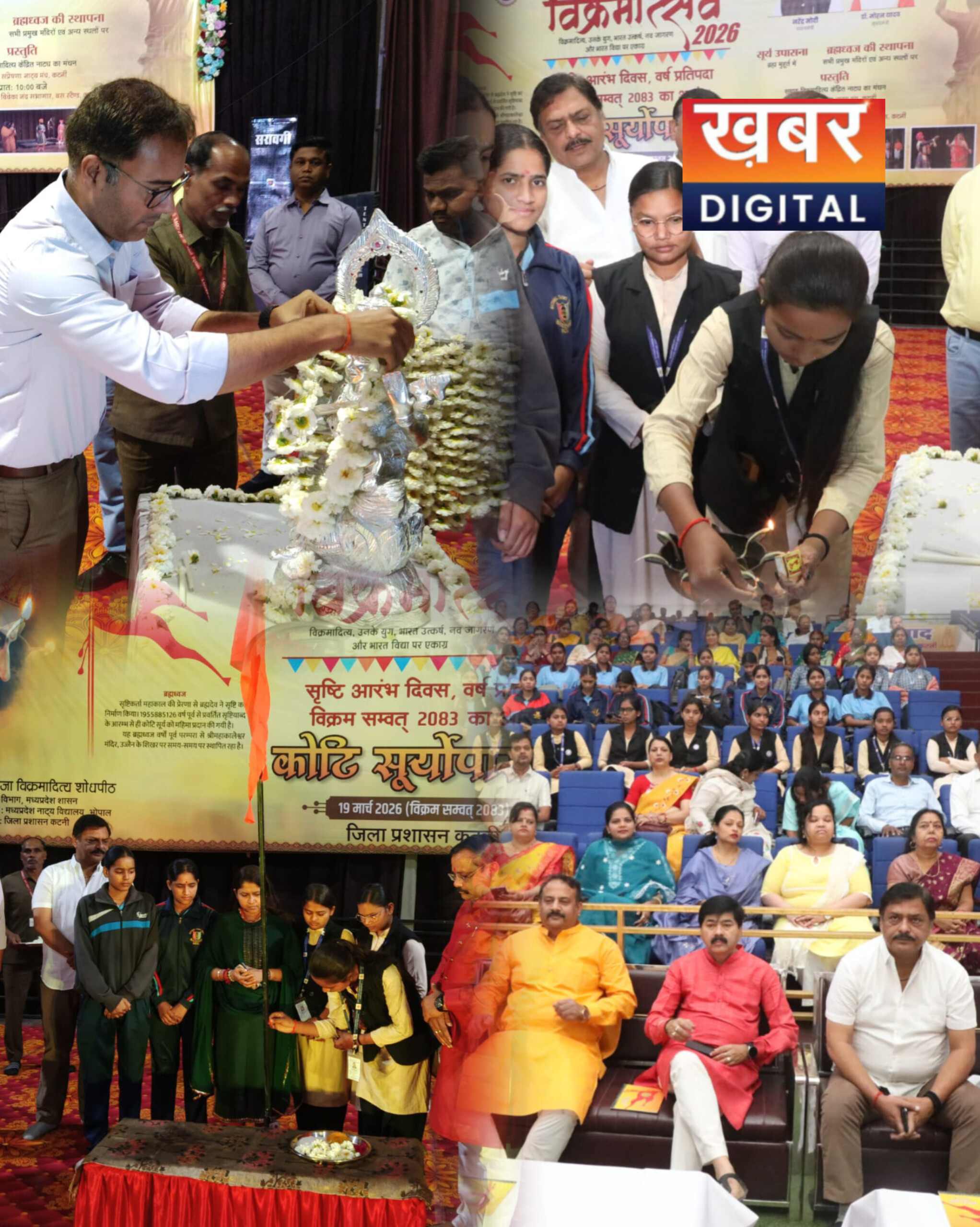 सौरभ श्रीवास्तव संवाददाता कटनी— सृष्टि के आरंभ दिवस और भारतीय नववर्ष विक्रम संवत 2083 के पावन अवसर पर गुरुवार को बस स्टैंड स्थित ऑडिटोरियम में विक्रमोत्सव-2026 का भव्य और गरिमामयी आयोजन किया गया। कार्यक्रम में आस्था, संस्कृति और परंपरा का सुंदर संगम देखने को मिला।कार्यक्रम का शुभारंभ वीणा वादिनी मां सरस्वती की प्रतिमा पर माल्यार्पण एवं दीप प्रज्ज्वलन के साथ किया गया। इस अवसर पर संदीप जायसवाल (विधायक, मुड़वारा) और आशीष तिवारी (कलेक्टर) सहित अनेक जनप्रतिनिधि एवं गणमान्य नागरिक उपस्थित रहे।कार्यक्रम की शुरुआत बटुक आचार्यों द्वारा स्वास्तिवाचन के साथ हुई, जिससे पूरे सभागार में आध्यात्मिक वातावरण निर्मित हो गया। विक्रमोत्सव के इस आयोजन में भारतीय संस्कृति, परंपराओं और नववर्ष के महत्व को विशेष रूप से रेखांकित किया गया।आयोजन के दौरान सांस्कृतिक प्रस्तुतियों और वैदिक परंपराओं के माध्यम से उपस्थित जनसमूह को भारतीय सभ्यता की समृद्ध विरासत से रूबरू कराया गया। पूरे कार्यक्रम में उत्साह और श्रद्धा का माहौल बना रहा।