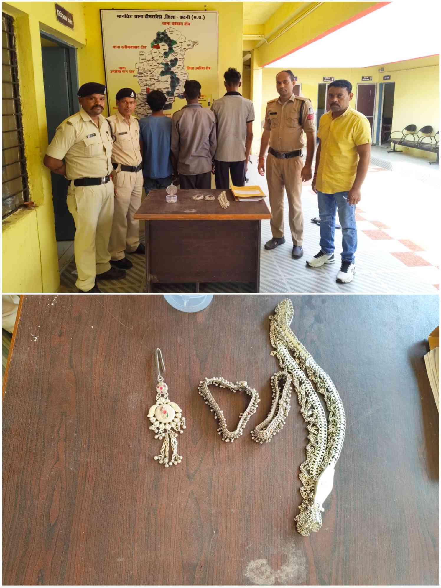 कटनी– पुलिस अधीक्षक कटनी द्वारा चोरी के घटनाओं करने वाले व्यक्तियों के विरूद्ध प्रभावी कार्यवाही करने हेतु आदेशित किया गया था जिसके पालन में अभिनव विश्वकर्मा पुलिस अधीक्षक कटनी के मार्ग दर्शन में अतिरिक्त पुलिस अधीक्षक डॉ. श्री संतोष डेहरिया व एसडीओपी स्लीमनाबाद श्रीमति आकांक्षा चतुर्वेदी के निर्देशन मे थाना प्रभारी ढीमरखेडा के नेतृत्व में दिनांक 14.08.25 को सुने घर में तला तोडकर चोरी करने वाले 03 आरोपियों को गिरफतार किया गया।घटना का विवरण दिनांक 13.08.25 को प्रार्थी विश्वनाथ चौबे पिता बंसत चौबे उम्र 34 साल निवासी ग्राम देवरीमंगेली थाना उमरियापान हाथ ग्राम कटरिया थाना ढीमरखेडा का उपस्थित होकर बताया कि मै ग्राम कटरिया में रहकर खेती किसानी का काम करता हूँ दिनांक 06.08.25 को रक्षाबंधन के त्यौहार में अपने गांव देवरीमंगेली चला गया था। जब दिनांक 13.08.25 को दोपहर 01 बजे करीबन ग्राम कटरियाअपने किराये के घर पहुंचा तो देखा घर की छप्पर हटी हुई थी ताला खोलकर अंदर गया तो मकान के अंदर कमरे का दरवाजे का ताला टूटा था तो मैं अंदर जाकर देखा तो कमरे के अंदर रखी पेटी खुली थी पेटी का सामान बिखरा हुआ था तो पेटी में रखे चांदी का डोरा एक पायल एक चांदी का गुच्छा कुल किमती 50000 / को अज्ञात चोर चोरी कर ले गया की रिपोर्ट पर अपराध कंमाक 331 (4),305ए बीएनएस कर रिपोर्ट को गंभीरता से लेकर तत्वरित कार्यवाही करते हुये कुछ ही घंटो में प्रकरण के तीन आरोपी दुर्गेश प्रजापति, विनीत प्रजापति, बंसत प्रजापति तीनो निवासी ग्राम कटरिया को हिरासत में लेकर पूछताछ की गई जिनके द्वारा अपराध करना स्वीकार किया गया जो आरोपियो के कब्जे से जेवर चांदी का डोरा, पायल, गुच्छा कुल किमती 50000/- बरामद किया गया है। आरोपियों को गिरफतार कर माननीय न्यायालय पेश किया गया है।पुलिस कार्यवाही में विशेष भूमिका थाना प्रभारी ढीमरखेडा मो. शाहिद, सउनि जयंचद उईके.आर. पंकज सिंह, आर. रंजीत सिंह, आर. कमोद कोल का विशेष योगदान रहा है।