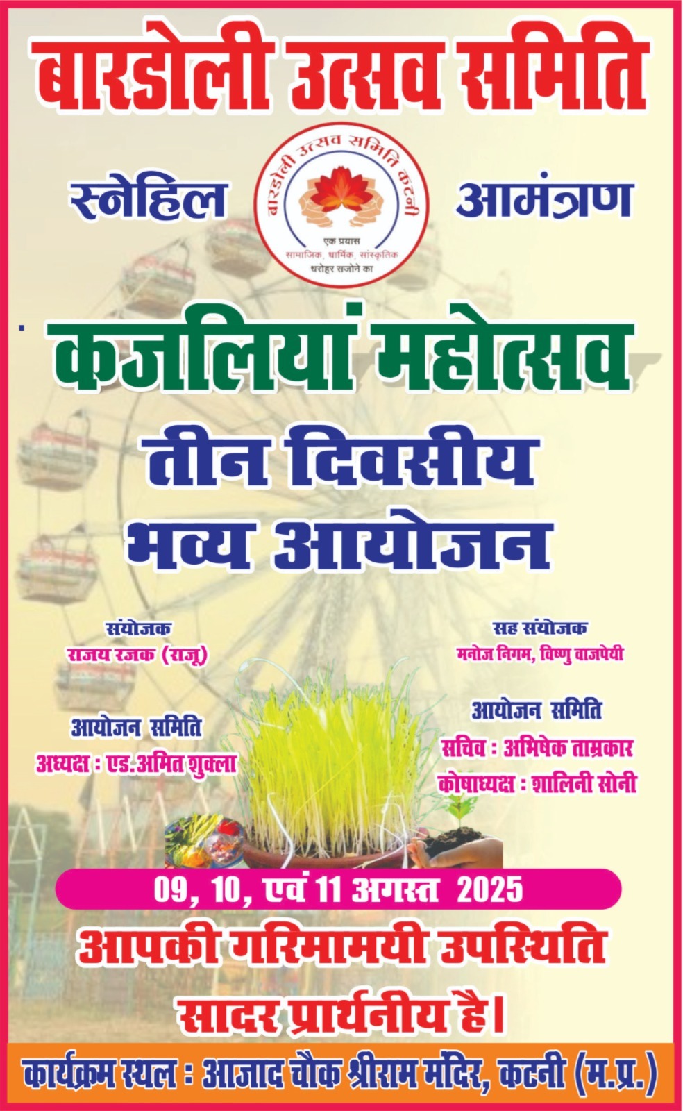*कटनी से संवाददाता सौरभ श्रीवास्तव कटनी – बारडोली उत्सव समिति द्वारा इस वर्ष भी कजलियां महोत्सव का तीन दिवसीय भव्य आयोजन किया जा रहा है। आयोजन 09, 10 एवं 11 अगस्त 2025 को शहर के आजाद चौक श्रीराम मंदिर परिसर में होगा।समिति के संयोजक राजय रजक (राजू) ने बताया कि यह महोत्सव सामाजिक, धार्मिक और सांस्कृतिक धरोहर को संजोने का एक प्रयास है। आयोजन समिति के अध्यक्ष एडवोकेट अमित शुक्ला, सह संयोजक मनोज निगम एवं विष्णु वाजपेयी हैं। सचिव अभिषेक ताम्रकार और कोषाध्यक्ष शालिनी सोनी ने सभी नागरिकों से कार्यक्रम में शामिल होकर आयोजन को सफल बनाने की अपील की है।कार्यक्रम के दौरान पारंपरिक अनुष्ठानों के साथ विभिन्न सांस्कृतिक प्रस्तुतियां और धार्मिक आयोजन होंगे। समिति ने सभी श्रद्धालुओं और नागरिकों से गरिमामयी उपस्थिति दर्ज कराने की विनती की है।