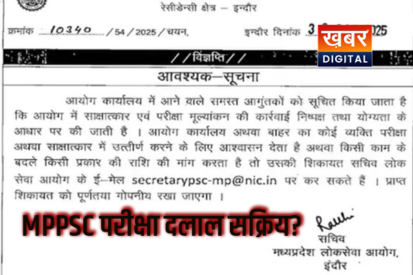 इंदौर/नरेंद्र महावर/खबर डिजिटल/ मध्य प्रदेश लोक सेवा आयोग ने अपनी आधिकारिक वेबसाइट पर एक आवश्यक सूचना जारी कर परीक्षार्थियों को आगाह किया है। इसका उद्देश्य अभ्यर्थियों को धोखाधड़ी बचाना और सतर्क करना है। यह कदम आयोग में वर्तमान में चल रहे विभिन्न साक्षात्कारों के बीच उठाया। आयोग ने स्पष्ट किया है कि यदि कोई भी व्यक्ति भर्ती या साक्षात्कार में पास कराने के नाम पर राशि की मांग करता है, तो तुरंत उसकी शिकायत आयोग के ईमेल पर कर सकते हैं।